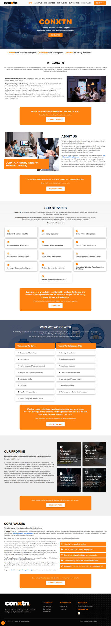 Project Overview : We designed and developed a professional website for Conxtn, a consulting firm focused on building meaningful connections and delivering strategic insights. The platform was crafted to reflect their core values of integrity, collaboration, and purposeful service, while highlighting their unique approach to driving informed decision-making. Our focus was on creating a clean, modern, and user-friendly experience that effectively communicates their vision and strengthens their brand presence.
