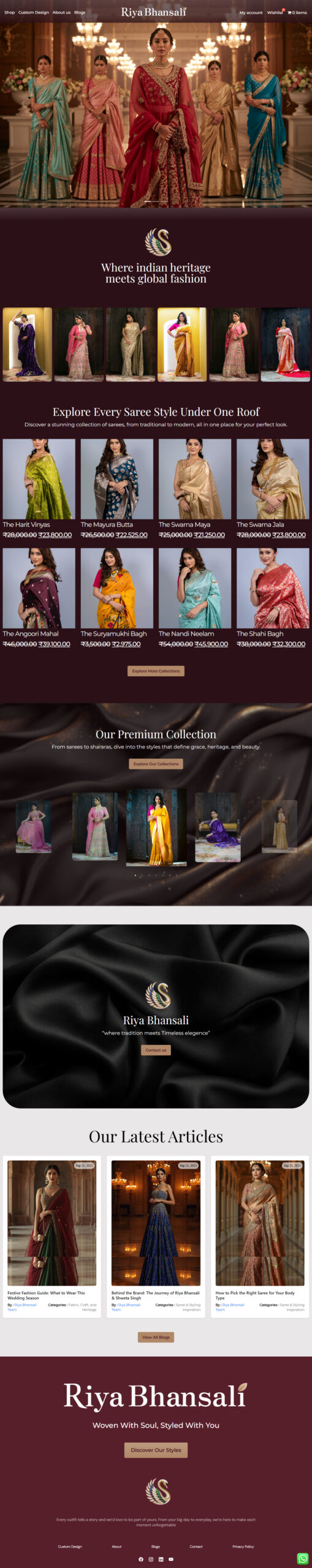 Project Overview : We had the privilege of designing and developing a refined digital presence for Riya Bhansali, a brand that beautifully blends traditional Indian heritage with modern fashion aesthetics. The website was crafted to reflect elegance, sophistication, and cultural richness, aligning perfectly with the brand’s identity. Our focus was on creating a visually immersive experience with clean layouts, smooth navigation, and responsive design to showcase their timeless collections. This project highlights our ability to translate a brand’s story into a compelling and high-performing online experience.