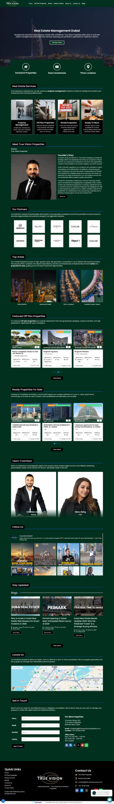 Project Overview : We designed and developed a modern and professional website for The True Vision Properties, a real estate company operating in Dubai’s dynamic property market. The platform was crafted to showcase their global expertise, leadership, and client-focused approach to buying, selling, and property management. Our focus was on creating a clean, trustworthy, and easy-to-navigate experience that highlights their services, builds credibility, and helps users explore property opportunities with confidence.